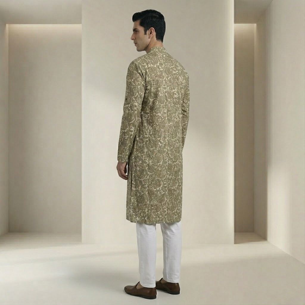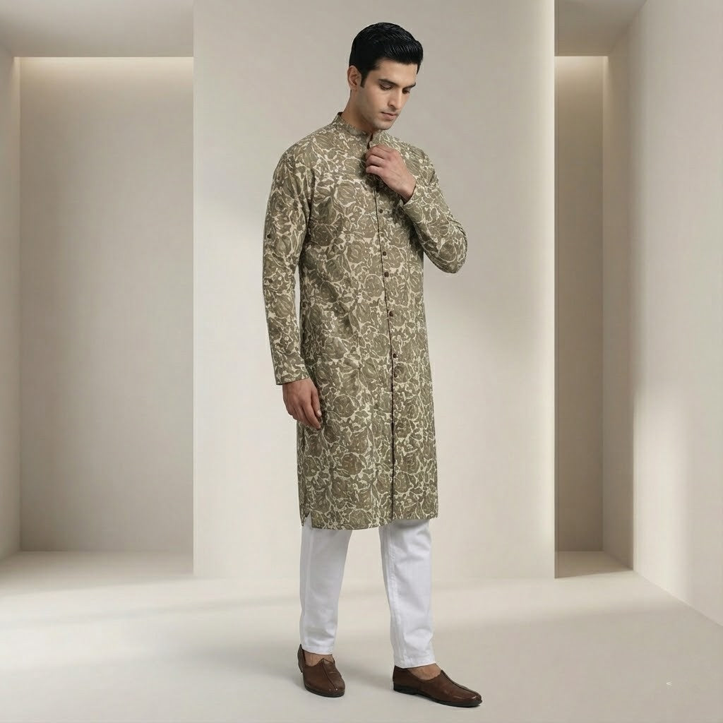 To complete the look of this kurta, you may consider pairing it with men's palazzobottom. Choosing a palazzo in a neutral or matching colour can enhance the overall style, making it suitable for both casual and festive occasions.