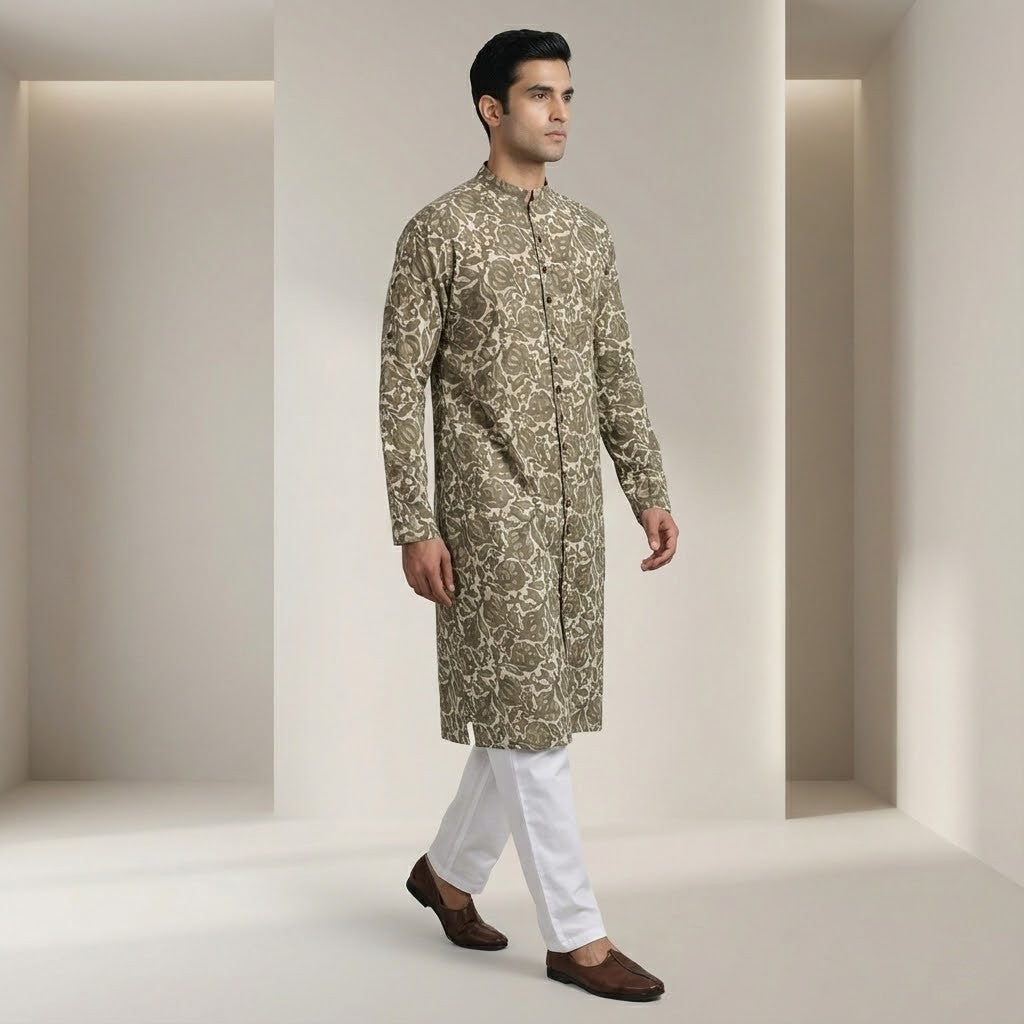 When fashioned into men's kurtas, Dabu Bagru infuses the garment with rustic elegance and historical charm, making it suitable for daily wear or festive occasions.