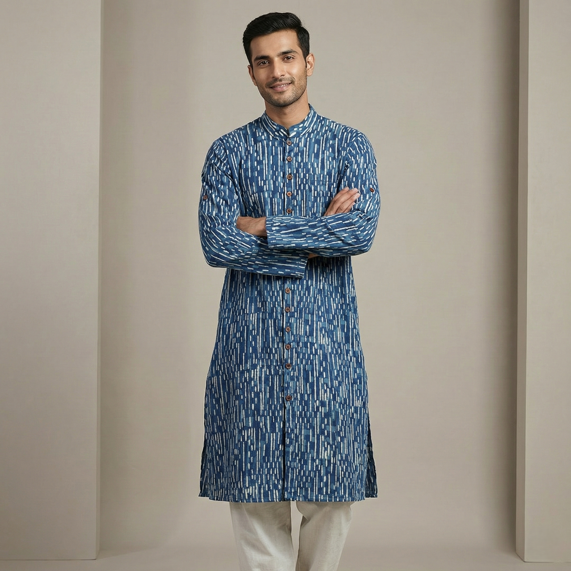Dabu Bagru Indigo is a time-honoured mud-resist printing technique that traces its roots to Rajasthan. Renowned for intricate patterns created through hand-applied resist paste and natural indigo dyes, Dabu Bagru features flowing motifs and rich blue hues that evoke both sophistication and tradition. When fashioned into men's kurtas, Dabu Bagru Indigo infuses the garment with rustic elegance and historical charm, making it suitable for daily wear or festive occasions.