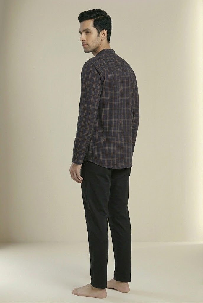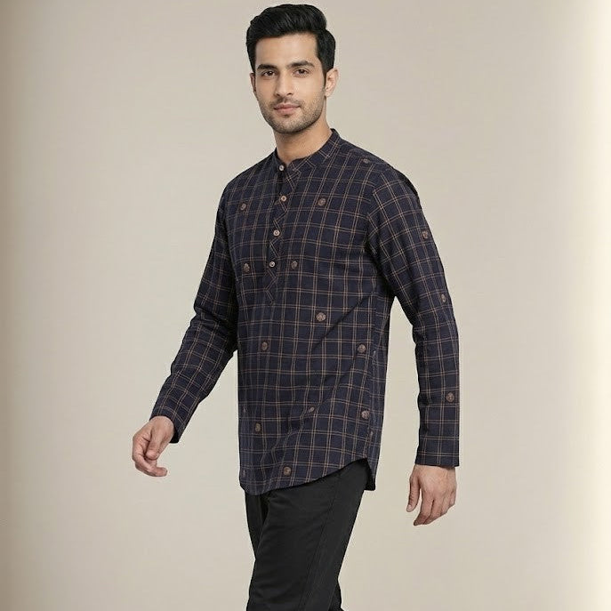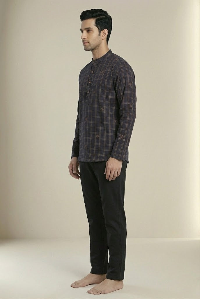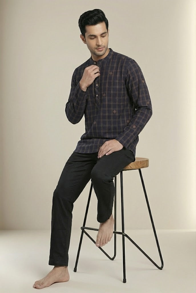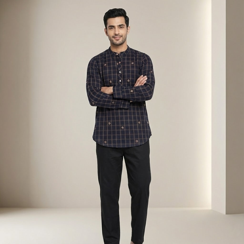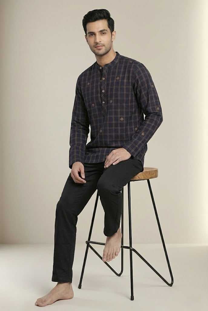 To complete the look of this kurta, you may consider pairing it with men's palazzobottom. Choosing a palazzo in a neutral or matching colour can enhance the overall style, making it suitable for both casual and festive occasions.